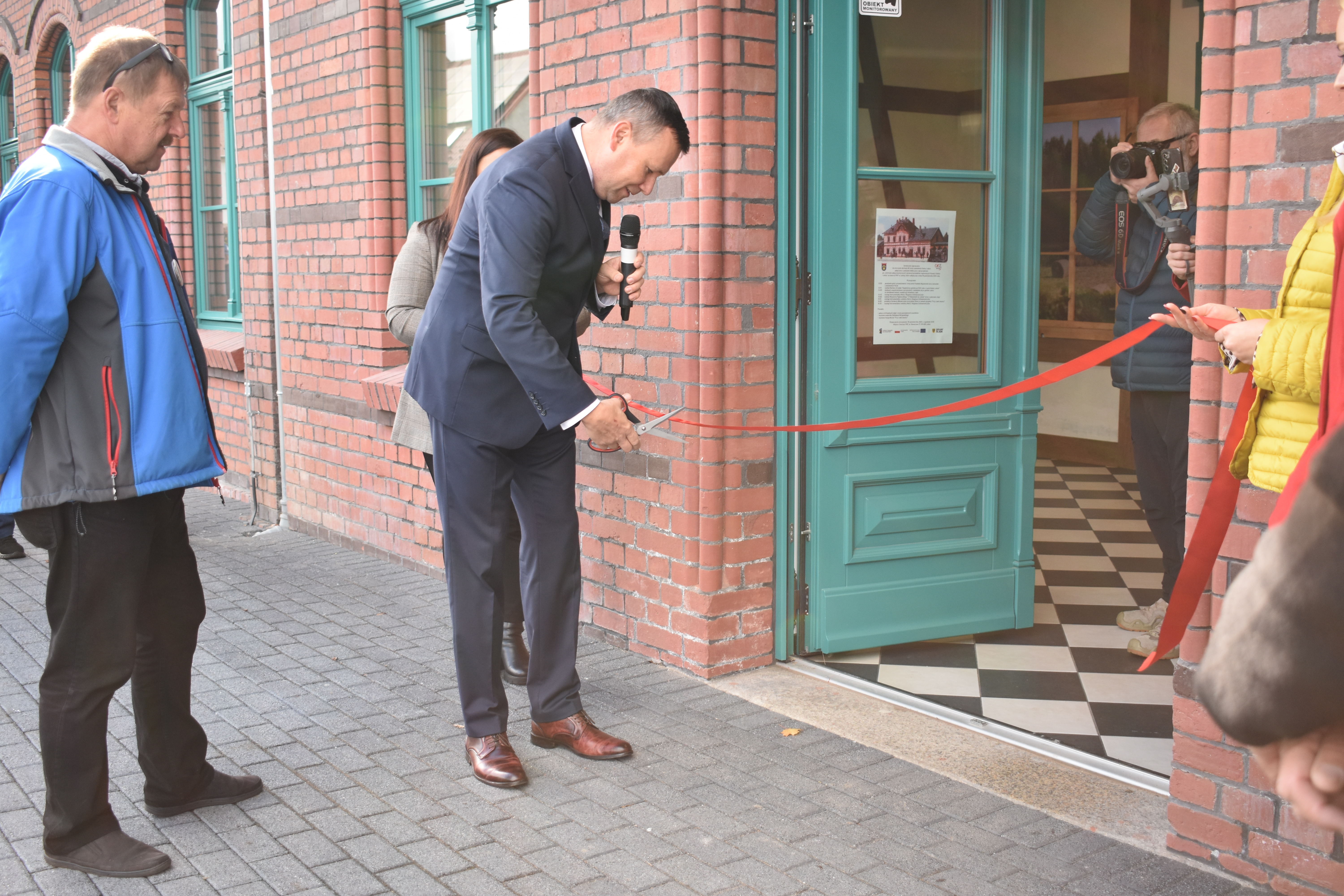Oficjalnie otwarty! Dworzec kolejowy po latach zaniedbań i kilku w remoncie — wreszcie będzie cieszył mieszkańców i turystów. Szymon Surmacz przecina wstęgę (źródło OKiS w Leśnej)