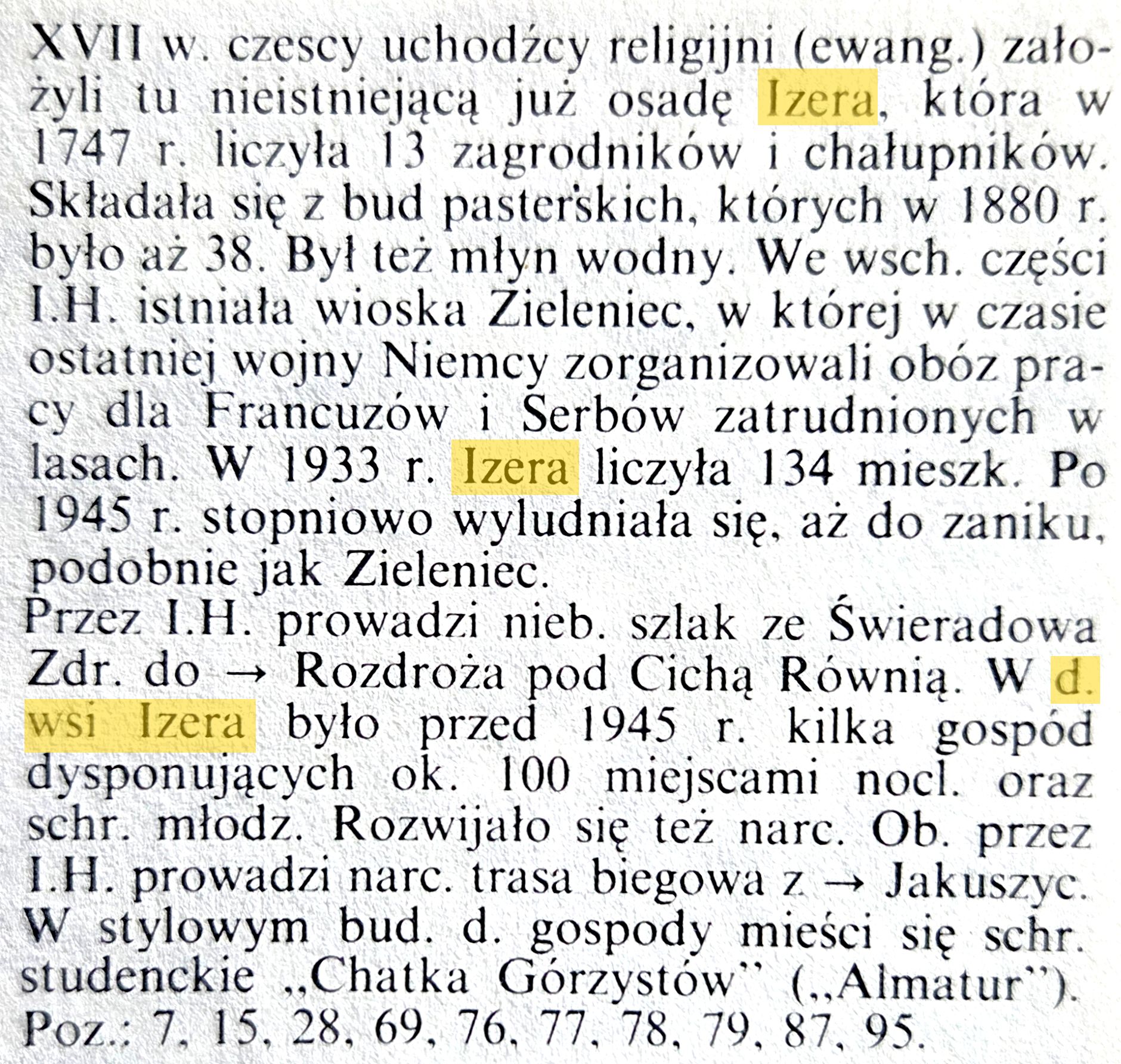 Wycinek strony 49 Słownika Geografii Turystycznej Sudetów GÓRY IZERSKIE, gdzie autorzy trzykrotnie wymieniają nazwę osady Izera