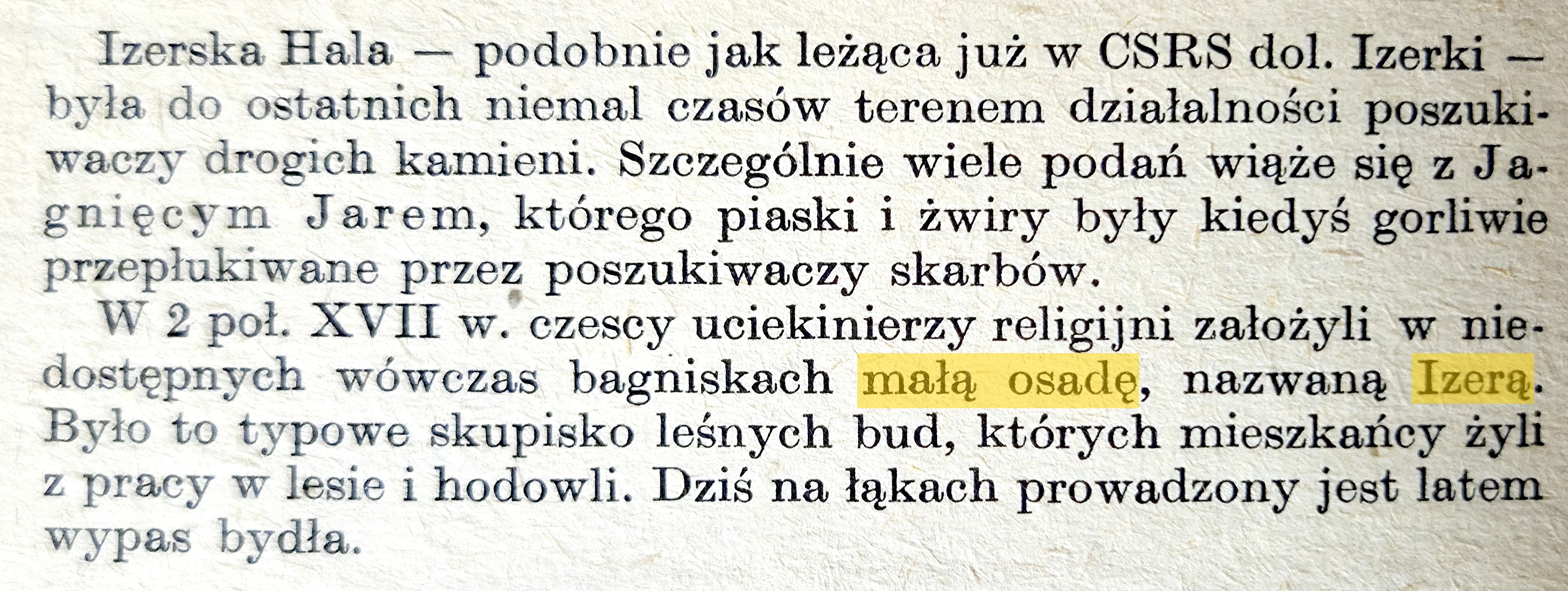 Znów pod hasłem "Hala Izerska" autor wzmiankuje "małą osadę, nazywaną Izerą". Jak widać T. Steć poprawnie nazwał osadę, wymieniając jej urzędową nazwę. Inaczej niż na swej słynnej mapie-steciówce przed 10 laty, kiedy zamieścił niemiecką kalkę "Wielka Izera".