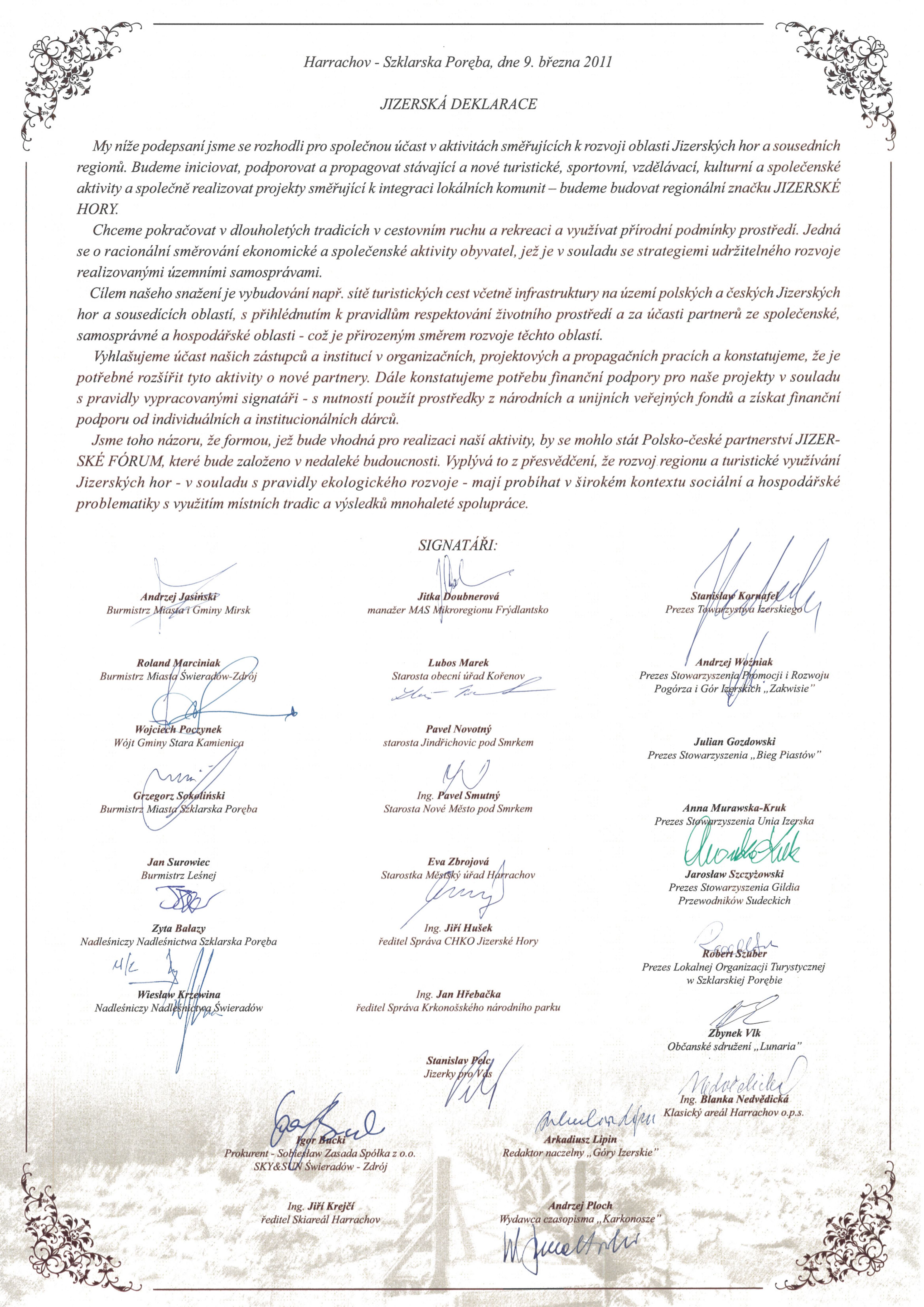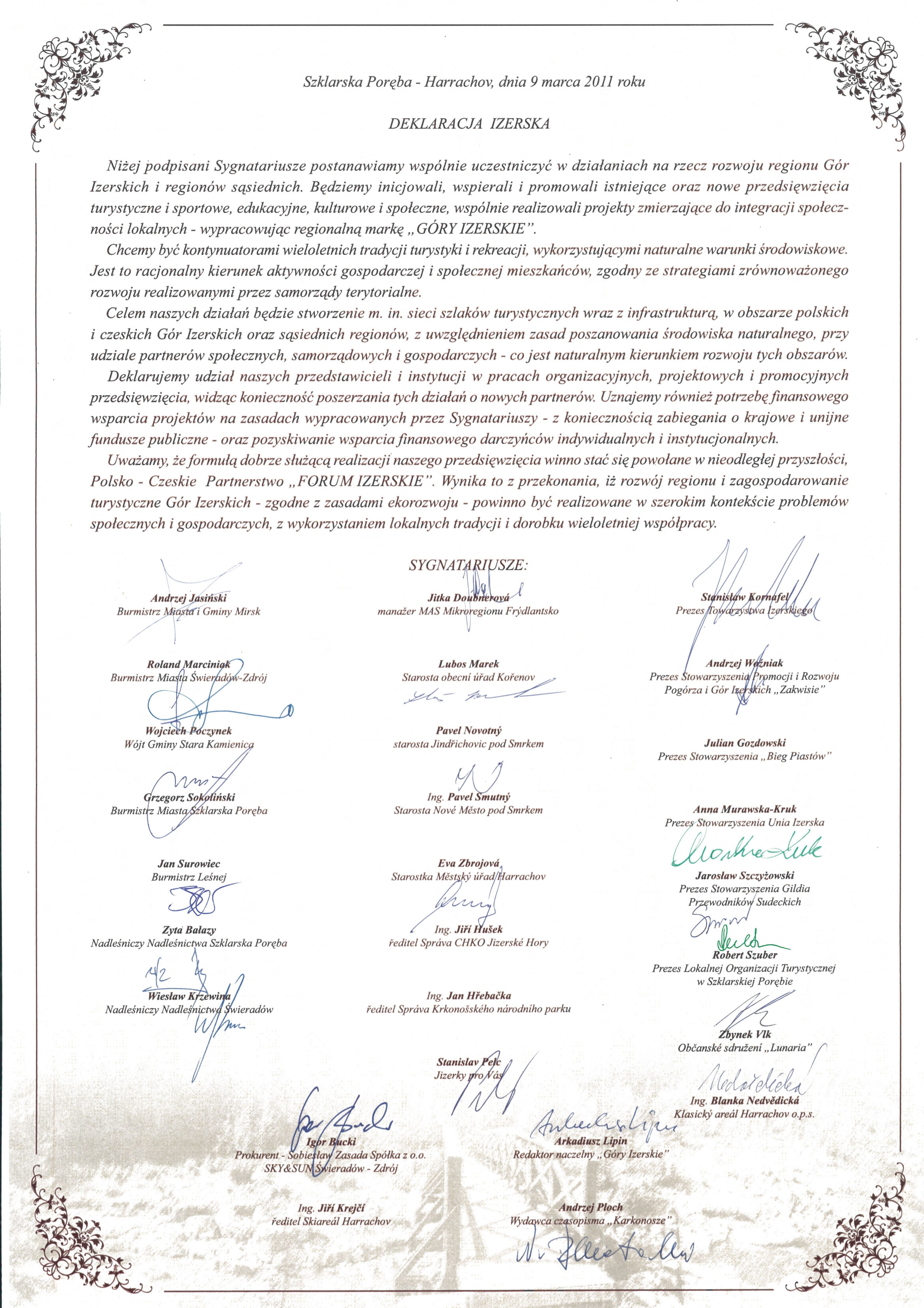 Od spotkania 9 marca 2011 roku w Gospodzie Granicznej BOMBAJ w Szklarskiej Porębie-Jakuszycach minęło 15 lat. W zaśnieżone jeszcze wówczas Góry Izerskie zjechało wiele ważnych osób. Spotkanie miało charakter uroczysty — podpisano wówczas DEKLARACJĘ IZERSKĄ. Dokument przygotowany przez Towarzystwo Izerskie, wyrażający wspólną wolę działania na rzecz rozwoju Gór Izerskich po obu stronach polsko-czeskiej granicy. Miejsce wybrano nieprzypadkowo: przełęcz — styk kultur — pogranicze — symbol. W deklaracji zapisano rzeczy duże i poważne: rozwój przedsięwzięć turystycznych, sportowych, edukacyjnych, kulturalnych i społecznych, integrację lokalnych społeczności, budowę regionalnej marki Góry Izerskie, tworzenie sieci szlaków z infrastrukturą oraz powołanie Polsko-Czeskiego Partnerstwa Forum Izerskie. Miała powstać dwujęzyczna platforma współpracy, promocji i wspólnego projektowania przyszłości regionu.