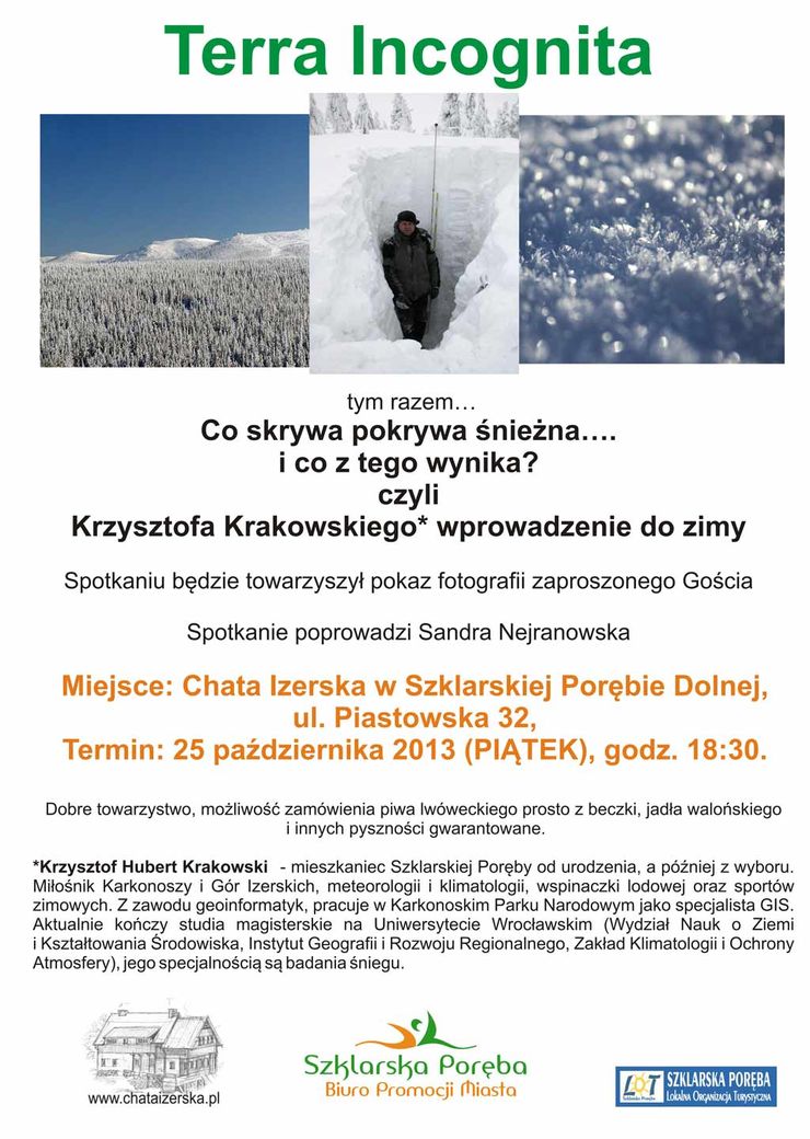 Opowie zafascynowany śniegiem Krzysztof Hubert Krakowski. Mieszkaniec Szklarskiej Poręby od urodzenia, a później z wyboru. Miłośnik Karkonoszy i Gór Izerskich, meteorologii i klimatologii, wspinaczki lodowej oraz sportów zimowych. Z zawodu geoinformatyk, pracuje w Karkonoskim Parku Narodowym jako specjalista GIS. Aktualnie kończy studia magisterskie na Uniwersytecie Wrocławskim (Wydział Nauk o Ziemi i Kształtowania Środowiska, Instytut Geografii i Rozwoju Regionalnego, Zakład Klimatologii i Ochrony Atmosfery). Jego specjalnością są badania śniegu.