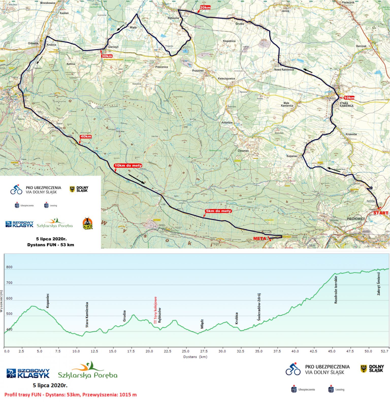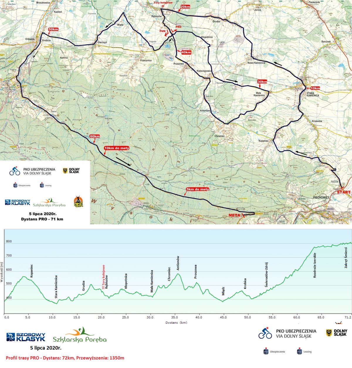 Tradycyjnie kolarze ścigać się będą na dwóch dystansach. Na przepięknej i widokowej trasie przez Góry i Pogórze Izerskie. Start honorowy przy SKI Arenie Szrenica w Szklarskiej Porębie, a ostry z Piechowic, przez Starą Kamienicę, Grudzę, Rębiszów, Gierczyn i Świeradów–Zdrój. Na koniec długi finisz i meta na Wielkim Zakręcie, zwanym Śmierci, nad Szklarską Porębą. Dystans FUN to 53 km, a PRO — 72 km. Suma przewyższeń na każdym dystansie znacznie przekroczy 1000 m.