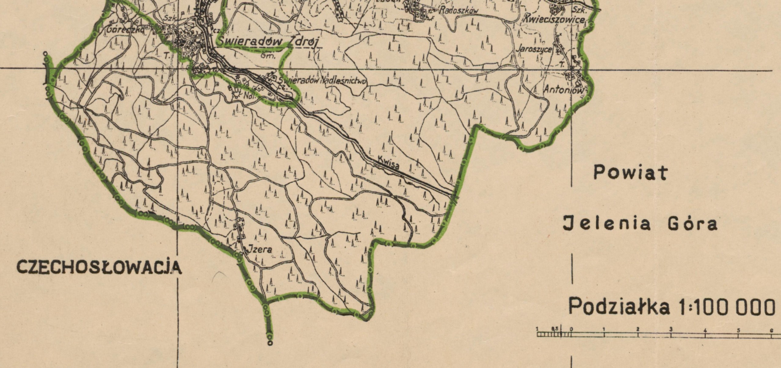 Izera na wycinku mapy powiatu lwóweckiego, opracowanej przez Główny Urząd Pomiarów Kraju. Wydział Pomiarów Urzędu Wojewódzkiego Wrocławskiego w 1949 r.