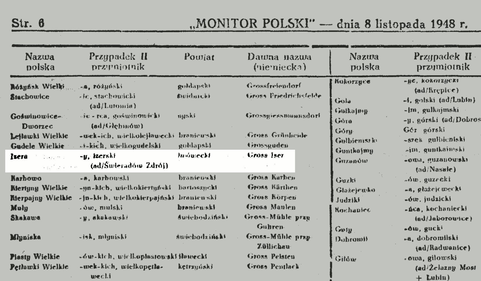 Rozporządzeniem ministerialnym z 8 listopada 1948 roku, także kolonia Groß-Iser otrzymała nazwę. Bardzo zgrabną, historyczną i oddającą w pełni istotę miejsca — Izera. Dlaczego to nazwa bardzo dobra, ugruntowana i właściwa — wyjaśniam w innym tekście. Poświęciłem już temu zagadnieniu obszerny artykuł w "Górach Izerskich", więc nie będę tego wywodu powtarzał. Odsyłam do lektury Izera nie jest wielka.